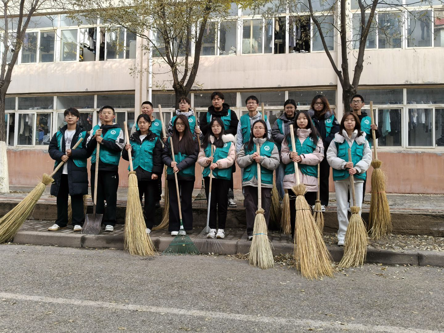 大家手持扫帚,默契配合,将散落各处的落叶一一归拢。尽管落叶量大,但同学们热情不减,忙碌的身影成为秋日校园里一道温暖的风景。