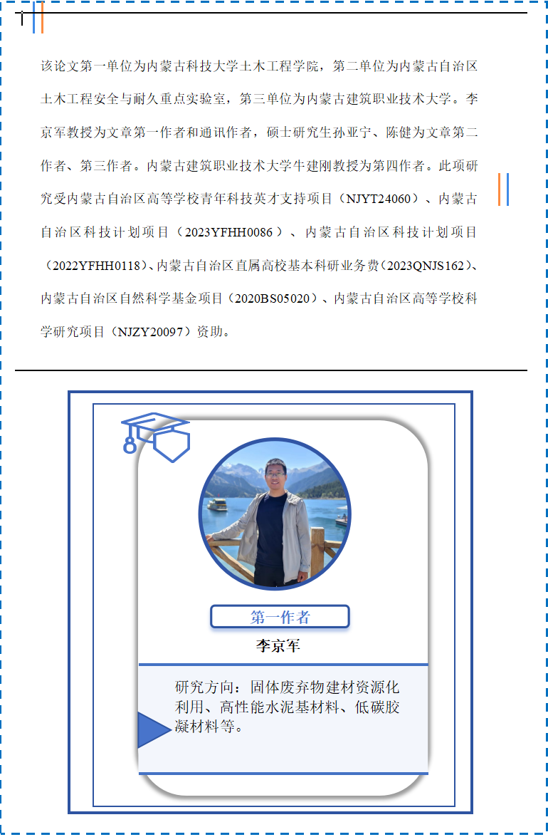 李京军,工学博士,教授(破格),硕士研究生导师,内蒙古自治区优秀青年基金获得者,入选内蒙古自治区“青年科技英才”、“英才兴蒙”和包头市“鹿城英才”、青年创新人才等人才专项计划。主要从事固体废弃物建材资源化利用和高性能水泥基材料方面的基础和应用研究。近五年,作为项目负责人主持国家自然科学基金、内蒙古自治区重点研发(4项)、中央引导地方项目、内蒙古优秀青年基金等国家级及省部级项目12项,地市级项目3项,企业项目2项,累计课题经费500余万元。累计发表高水平期刊论文40余篇,其中,中科院一区SCITOP期刊)15篇,授权发明专利5项,参与制定标准5部。