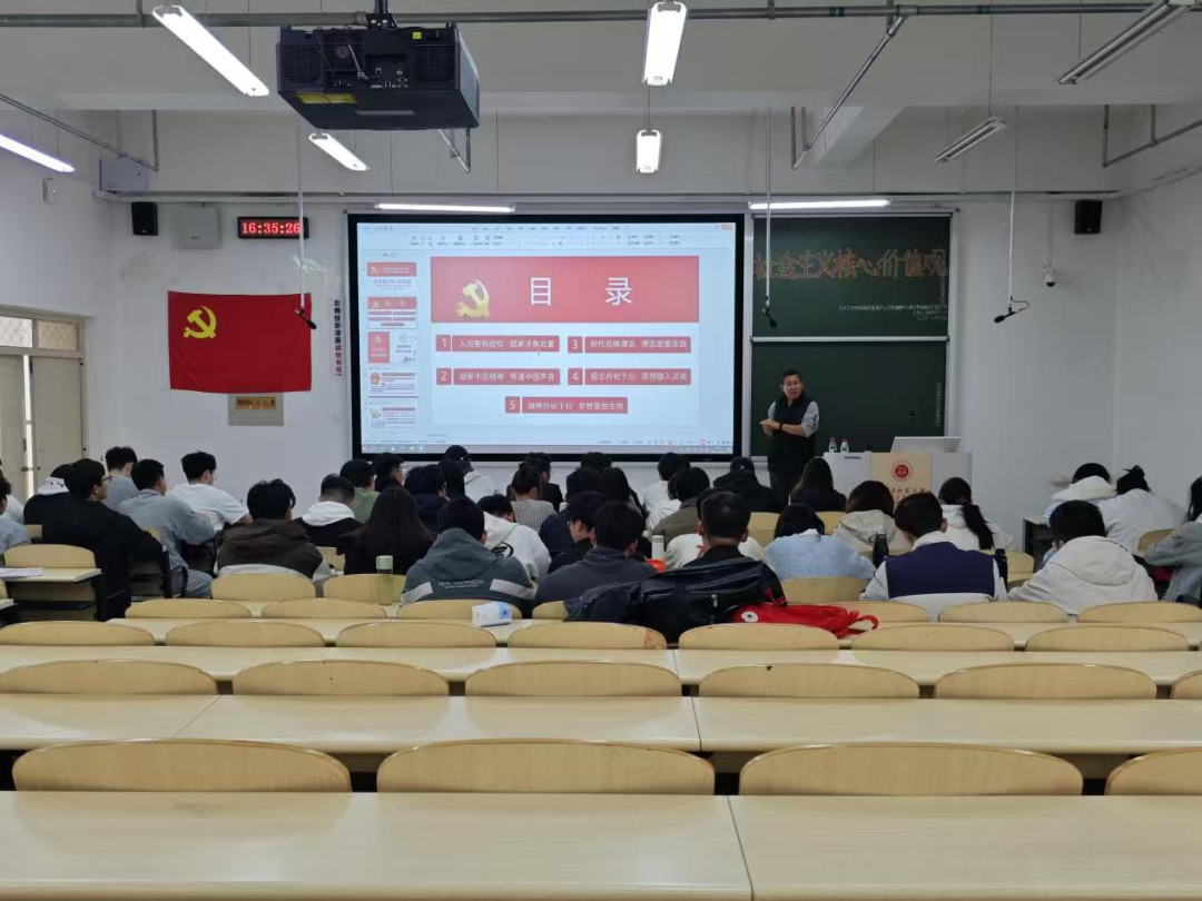 杨明明老师以“社会主义核心价值观”为主题进行授课。他讲解了社会主义核心价值观的内涵,并分析其重要意义。最后杨明明老师总结,社会主义核心价值观既是国家价值导向,也是青年行为准则,青年要加强学习践行,成长为可担民族复兴重任的时代新人。
