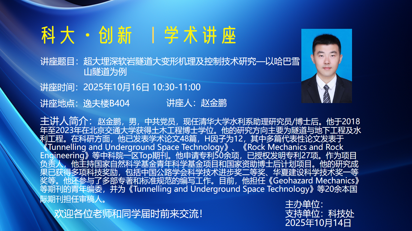 赵金鹏,男,中共党员,现任清华大学水利系助理研究员/博士后。他于2018年至2023年在北京交通大学获得土木工程博士学位。他的研究方向主要为隧道与地下工程及水利工程。在科研方面,他已发表学术论文48篇,H因子为12,其中多篇代表性论文发表于《Tunnelling and Underground Space Technology》、《Rock Mechanics and Rock Engineering》等中科院一区Top期刊。他申请专利50余项,已授权发明专利27项。作为项目负责人,他主持国家自然科学基金青年科学基金项目和国家资助博士后计划项目。他的研究成果已获得多项科技奖励,包括中国公路学会科学技术进步奖二等奖、华夏建设科学技术奖一等奖等。他还参与了多部专著和标准规范的编写工作。目前,他担任《Geohazard Mechanics》等期刊的青年编委,并为《Tunnelling and Underground Space Technology》等20余本国际期刊担任审稿人。